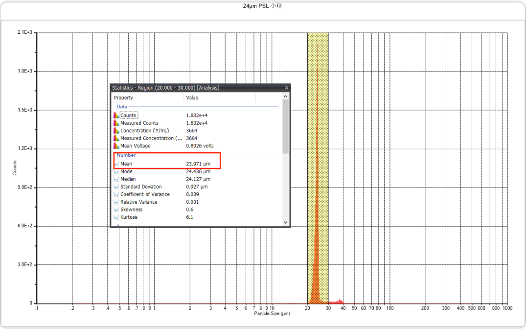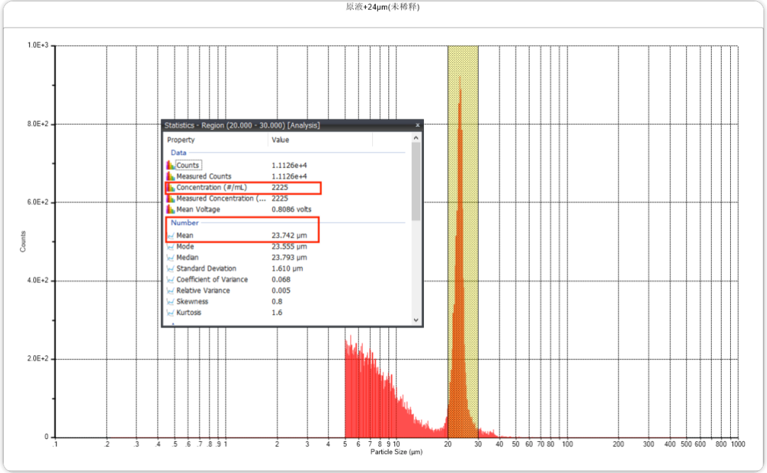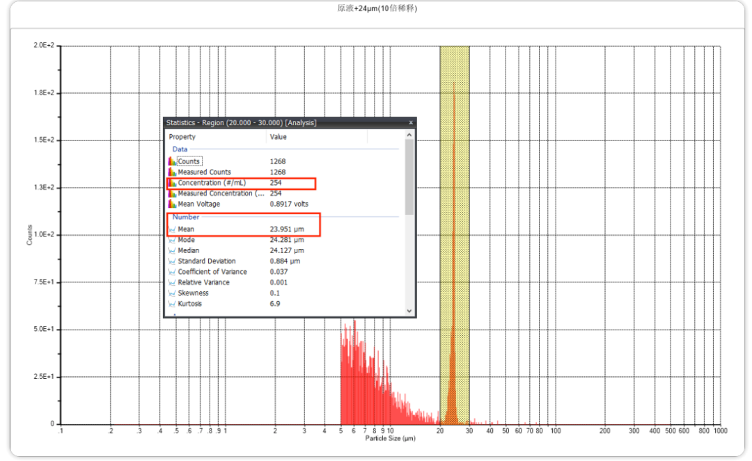 将24μm标粒添加到纯化水中,平均粒径为23.971μm,然后将24μm标粒添加到样品原液中制得样1,进行检测,平均粒径为23.734μm,浓度2225颗/mL,将样1稀释5倍,测试的平均粒径为23.734μm,浓度537颗/mL;再将样1稀释10倍,平均粒径为23.951μm,浓度254颗/mL。