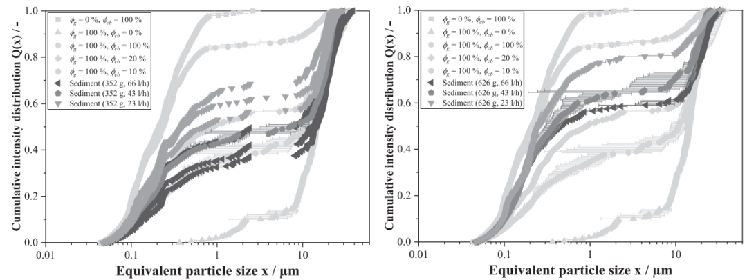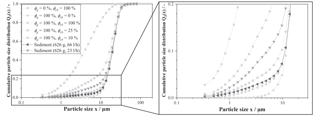 图14 在626g恒定离心加速度以及不同体积流量下,从卧螺离心机获取的参考测量值与沉积物样本的累积粒度分布