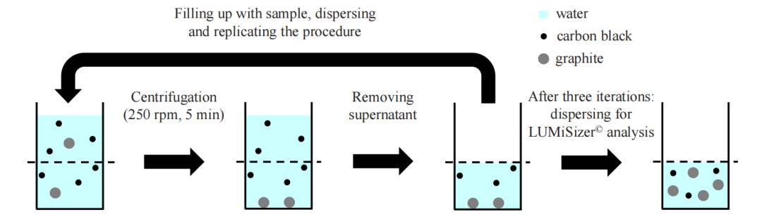 通过LUMiSizer沉降分析和激光衍射两种方法,结合卧螺离心机的离心分级实验,评估石墨和炭黑的分离效果。