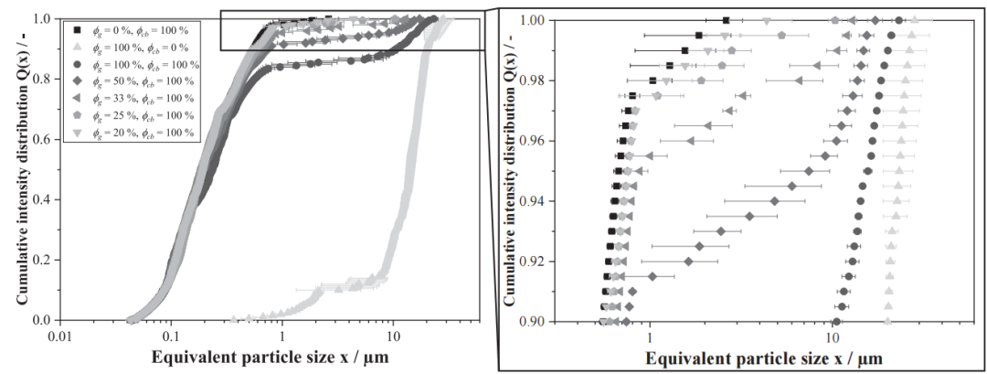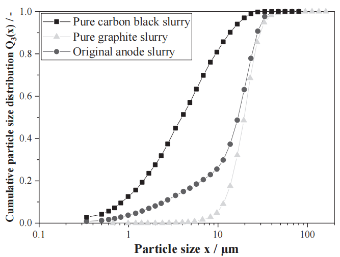 1)图7显示了原始负极浆料、纯炭黑浆料和纯石墨浆料的体积加权累积粒度分布 Q?(x)。石墨颗粒的平均粒径 X50,3为21.2μm,分布较窄(Span值为0.9);炭黑颗粒的平均粒径X50,3为4.4μm,分布较宽(Span值为3.2)。石墨颗粒主要分布在较粗的粒径范围,炭黑颗粒主要在较细的粒径范围,两者仅在约 7~23μm范围内有重叠,原始浆料呈现双峰分布,这表明激光衍射法可根据粒度差异估算两者在水性浆料中的比例。