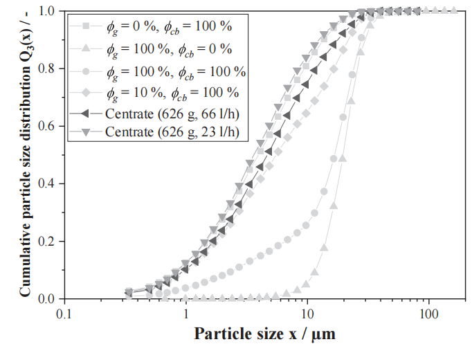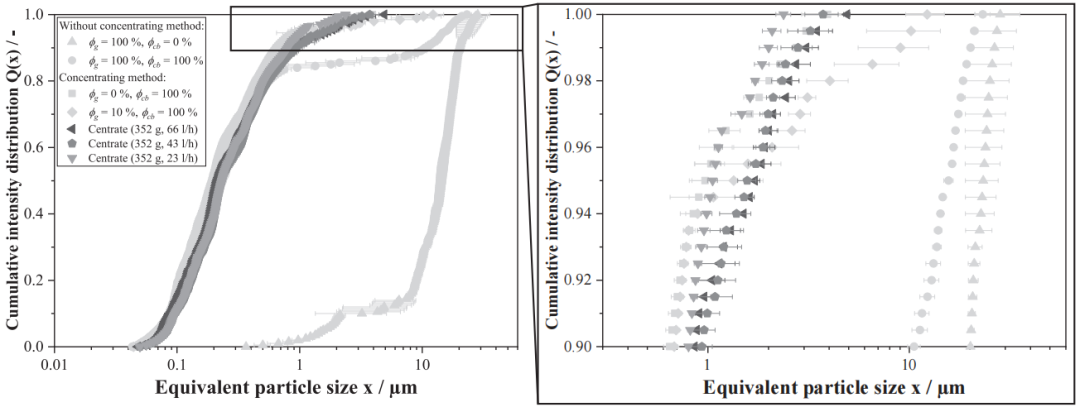 图10 在352g的恒定离心加速度和来自卧螺离心机的不同体积流量下采集的浓缩样品的累积强度分布