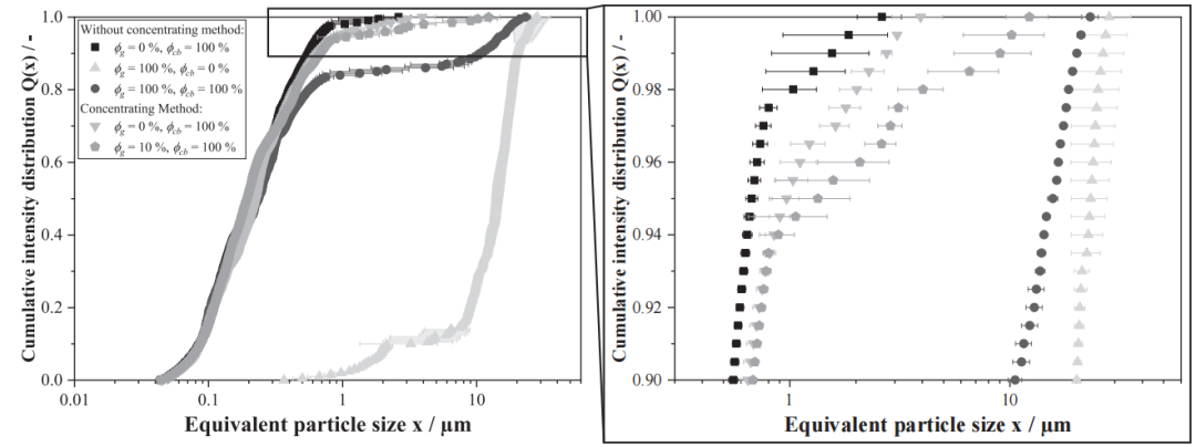 图5 纯石墨、纯炭黑、原始负极浆料,以及炭黑含量恒定且石墨含量为10%并经过浓缩法处理和未经过浓缩法处理的负极浆料的累积强度分布