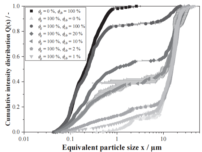 图6 纯石墨、纯炭黑以及含有不同含量炭黑的负极浆料的累积强度分布