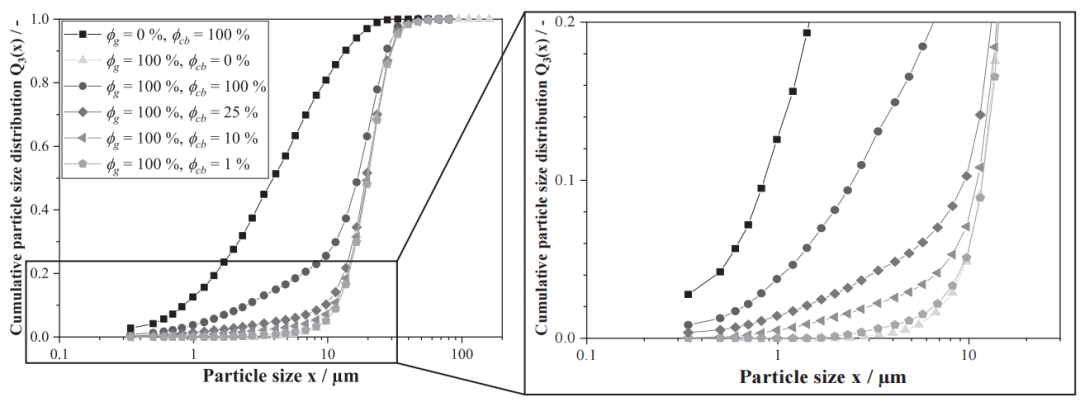 图7 激光衍射法测定的纯炭黑和石墨浆料的累积粒度分布