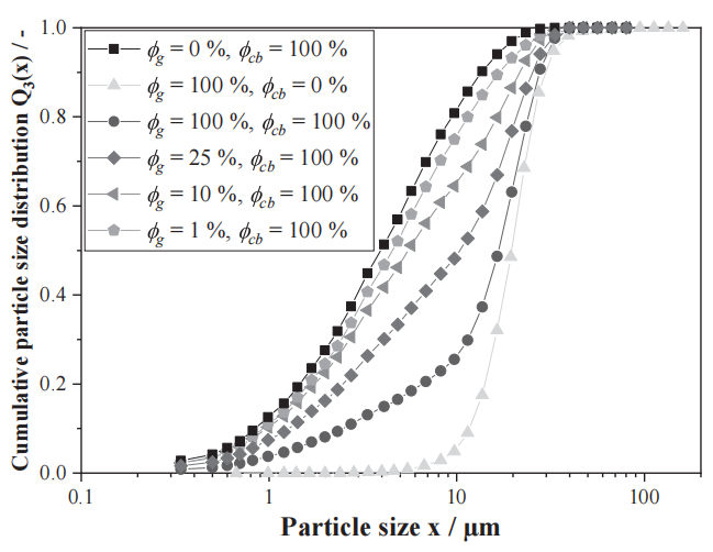 图4 纯石墨、纯炭黑以及含不同量石墨的负极浆料的累积强度分布