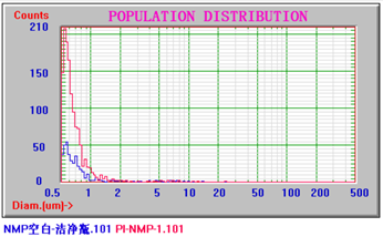 Fig.2 所示为NMP(N-甲基吡咯烷酮)溶剂及PI-NMP测试结果对比图。由于PI浆料本身粘度高达几千厘泊,故需用溶剂稀释后进行测试。通过图形,清楚了解不同粒径颗粒物含量;通过图形对比可快速评估不同样本差异。