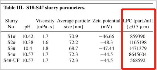 由表3.1分析可知,S1# - S4# Slurry的Zeta 电位略有不同,其他参数在误差范围内相似,没有明显偏差。然而,从图3.3可知,C4# 胶体二氧化硅和 S4# Slurry的 LPC(≥0.5μm)分别为 1340 万个/毫升和 800 万个/毫升,明显大于其他三组。
