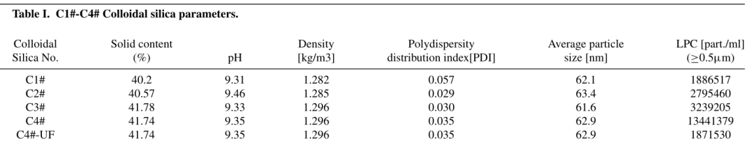 表2.1 C1#-C4# 胶体二氧化硅参数