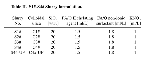 采用离子交换法制备4批胶体二氧化硅,参数相近(平均粒径62-63nm),配制FA/O基slurry;C4#-UF为C4#超滤后的样本。一共5个研磨液样品用于实验。详见表2.1和表2.2