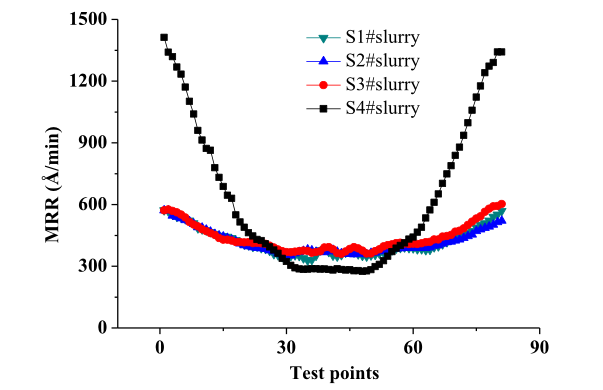 调整后 S4# Slurry的边缘 MRR 仍然明显高于中心,并且仍然高于 S1# - S3#,这表明机械因素,如压力、旋转速度不是原因;随即对Slurry的化学参数进行详细分析: