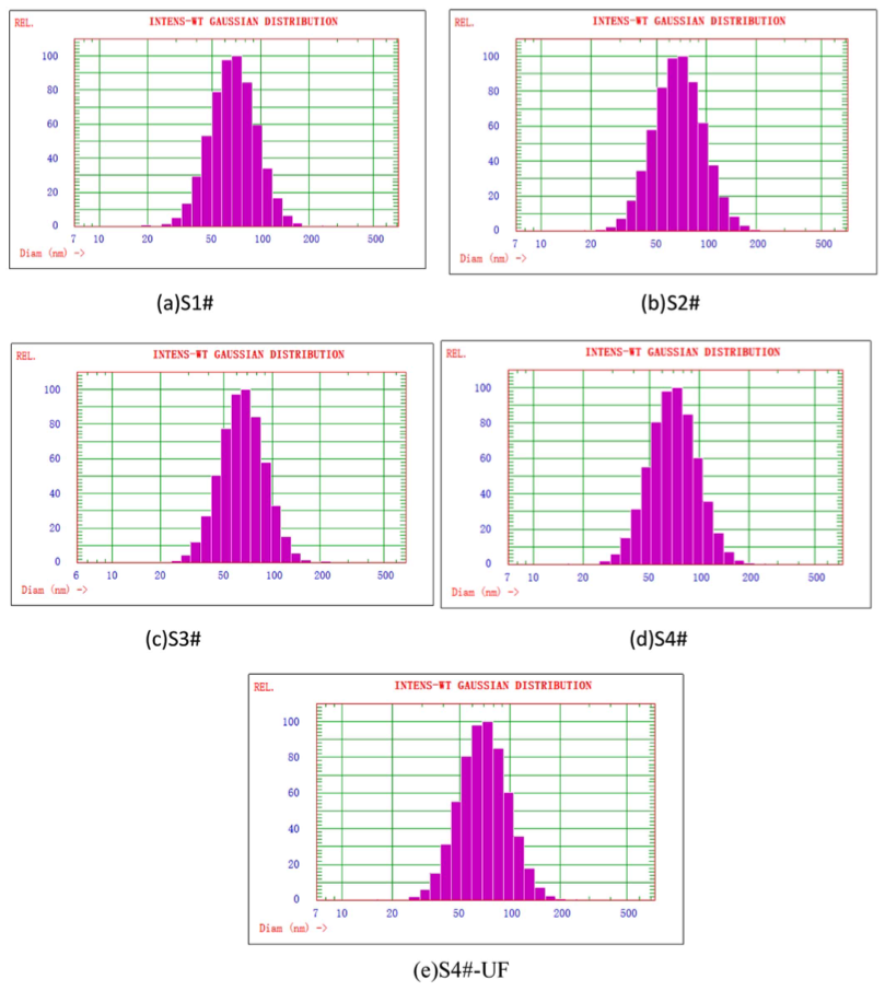 S4#-UF 研磨液的 pH 值、粘度、Zeta 电位和 LPC 见表3.2。其粒径分布图如图36所示。超滤对浆料的其他参数影响不大。