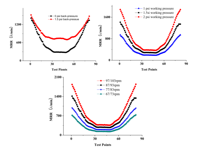 首先考虑机械因素的影响,在Slurry流速和抛光时间不变的情况下,手动调整背压、工作压力、机头速度和转盘转速,再测定MRR,结果如图3.2所示: