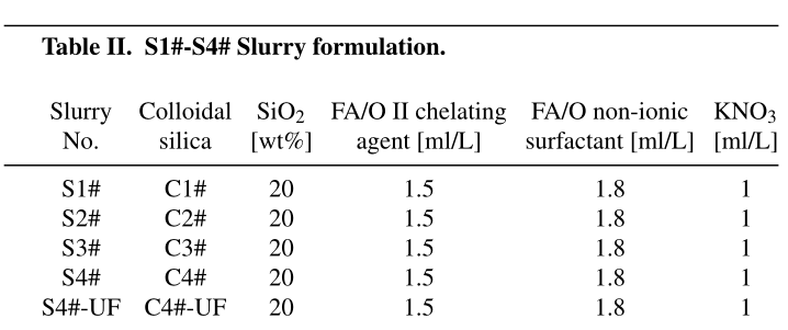 以往的研究大多关注CMP中的机械因素,缺乏考虑slurry理化性质(如pH、粘度、比重、Zeta电位等)对MRR、WIWNU和RMS粗糙度的影响,且大颗粒和大颗粒计数(LPC)对TEOS的MRR、WIWNU和RMS粗糙度的影响尚未得到广泛研究。