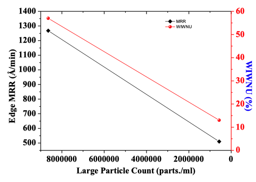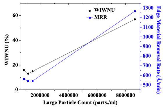 与LPC试验数据对比,当料浆LPC(≥0.5 μm)达到860万 颗/ml时,边缘MRR显著升高,WIWNU恶化,如图3.11a、3.11c所示。对当前大颗粒数据的分析表明,当浆料LPC(≥0.5 μm)小于1.47万 颗/ml,它会如图 3.10b 和图 3.10d所示。具有更低的MRR,但是WIWNU 更好,结果与文献中的纯数学模型一致。