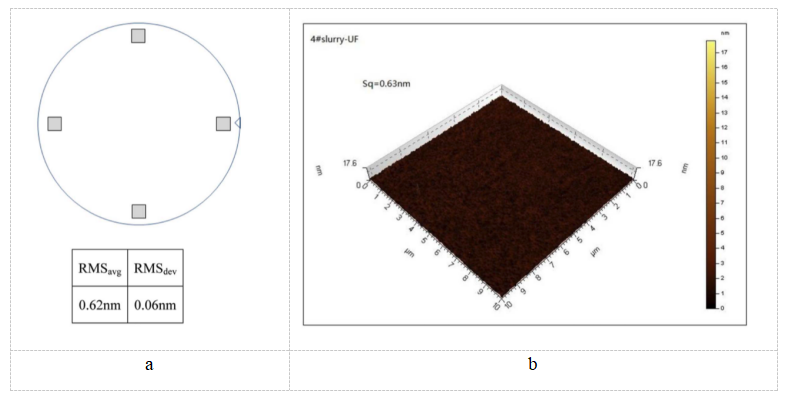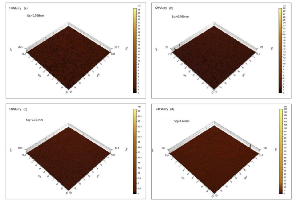 为了找出表面质量与大颗粒之间的关系,使用四组不同的Slurry进行抛光之后,进行AFM测量以评估抛光后的表面质量,表面形貌结果以均方根粗糙度RMS表示。