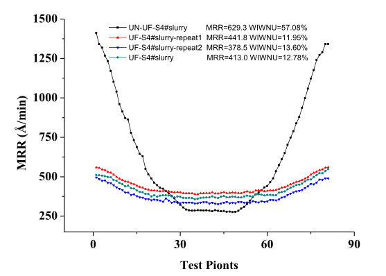 使用S4#和S4#-UF 浆料对TEOS进行抛光。测试点(距晶片边缘 5 毫米处)的 MRRS,采用S4#-UF 浆料进行抛光的,其值明显低很多。如图 7 所示,测试点的 MRR 从未经过滤前的 1400 Å/min 下降到过滤后的 600 Å/min,详情见图3.7。CMP过程中,垫子和载体在不同的中心上以一定的速度顺时针旋转。载体在衬垫上与晶圆同步地往复运动。粒子进入晶圆区域并随着垫旋转。一些粒子最终重新进入晶圆区域。这可能导致边缘的有效粒子浓度高于中心。