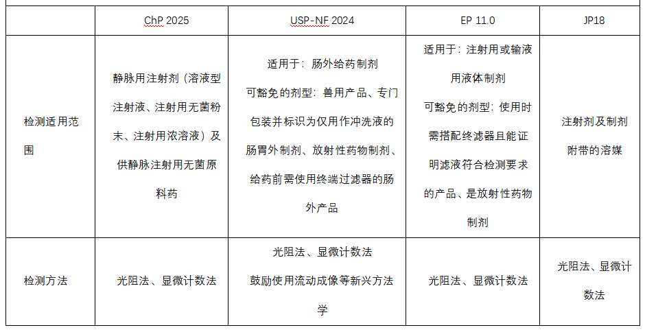 根据2020年版《中华人民共和国药典》通则<0903>[4],中国药典对不溶性微粒的检查范围是:静脉用注射剂(溶液型注射液、注射用无菌粉末、注射用浓溶液)及供静脉注射用无菌原料药中不溶性微粒的大小及数量。在2025年版《中华人民共和国药典》通则<0903>中,检测范围扩展到用于静脉注射、静脉滴注、鞘内注射、椎管内注射的溶液型注射液、注射用无菌粉末及注射用浓溶液,以及供注射用无菌原料药[5]。